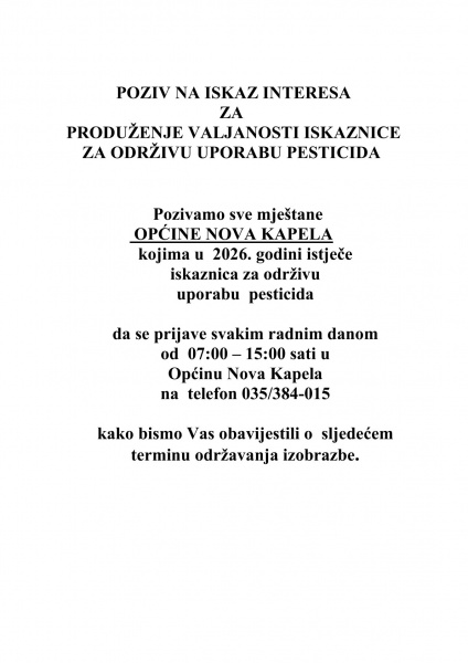 POZIV NA ISKAZ INTERESA ZA PRODUŽENJE VALJANOSTI ISKAZNICE ZA ODRŽIVU UPORABU PESTICIDA